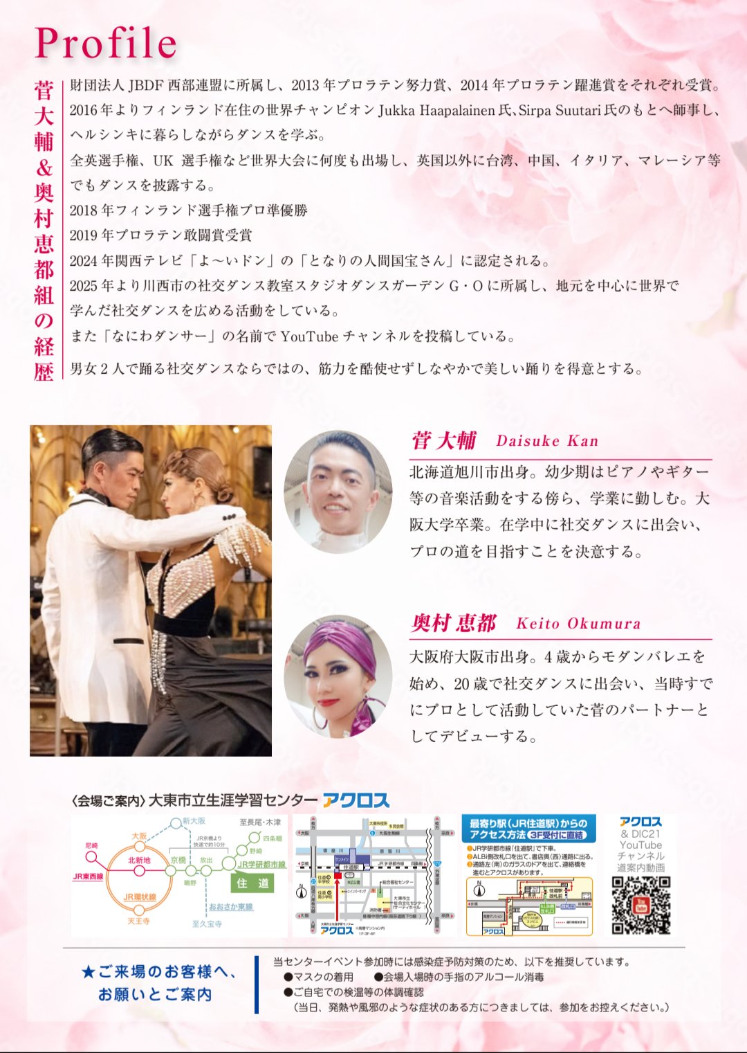 大阪府大東市立生涯学習センター「アクロス」主催による社交ダンスイベント「THE TEN DANCE」は、JBDF西部所属の菅大輔・奥村恵都組(スタジオダンスガーデンG・O)が出演。現役10ダンサーである彼らが踊る全10種目を解説付きでわかりやすく紹介する。プロの技と表現力をじっくり堪能できる鑑賞型イベント(ダンスタイム等なし)。