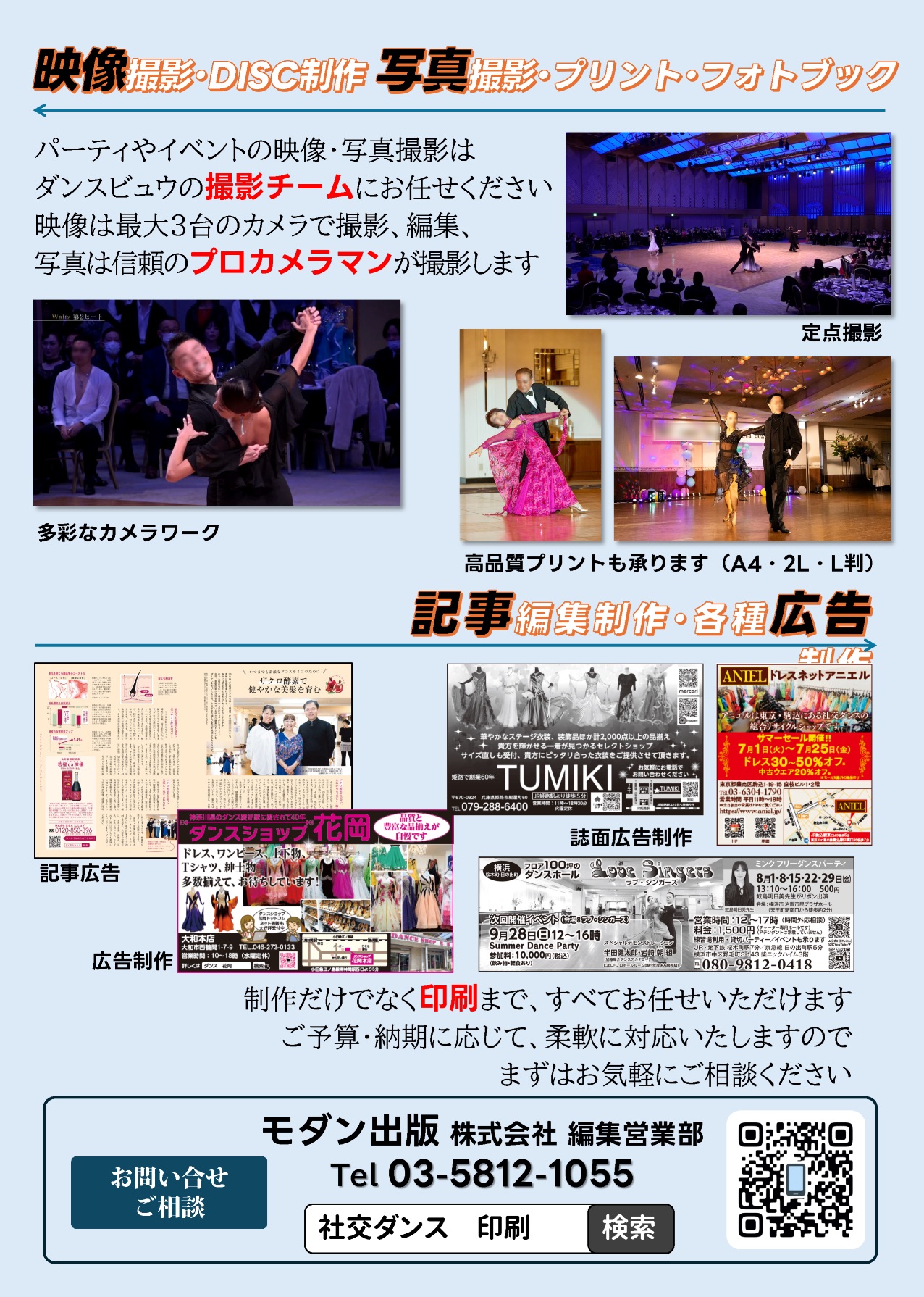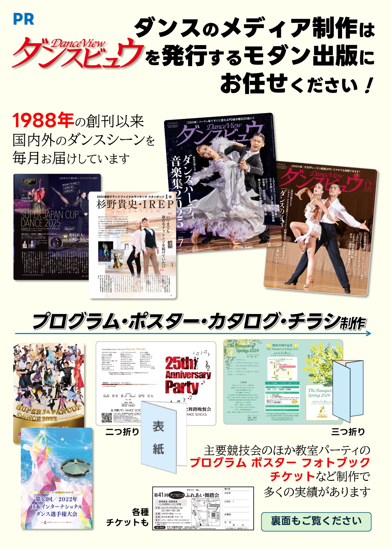 ダンスビュウ(株式会社モダン出版)では、雑誌・書籍の出版だけではなく、各種競技会やイベント、パーティのプログラムおよびチケットなどの制作・印刷のほか、イベントの企画運営・映像制作・写真撮影など、ダンスのあらゆる事業をサポートしています。