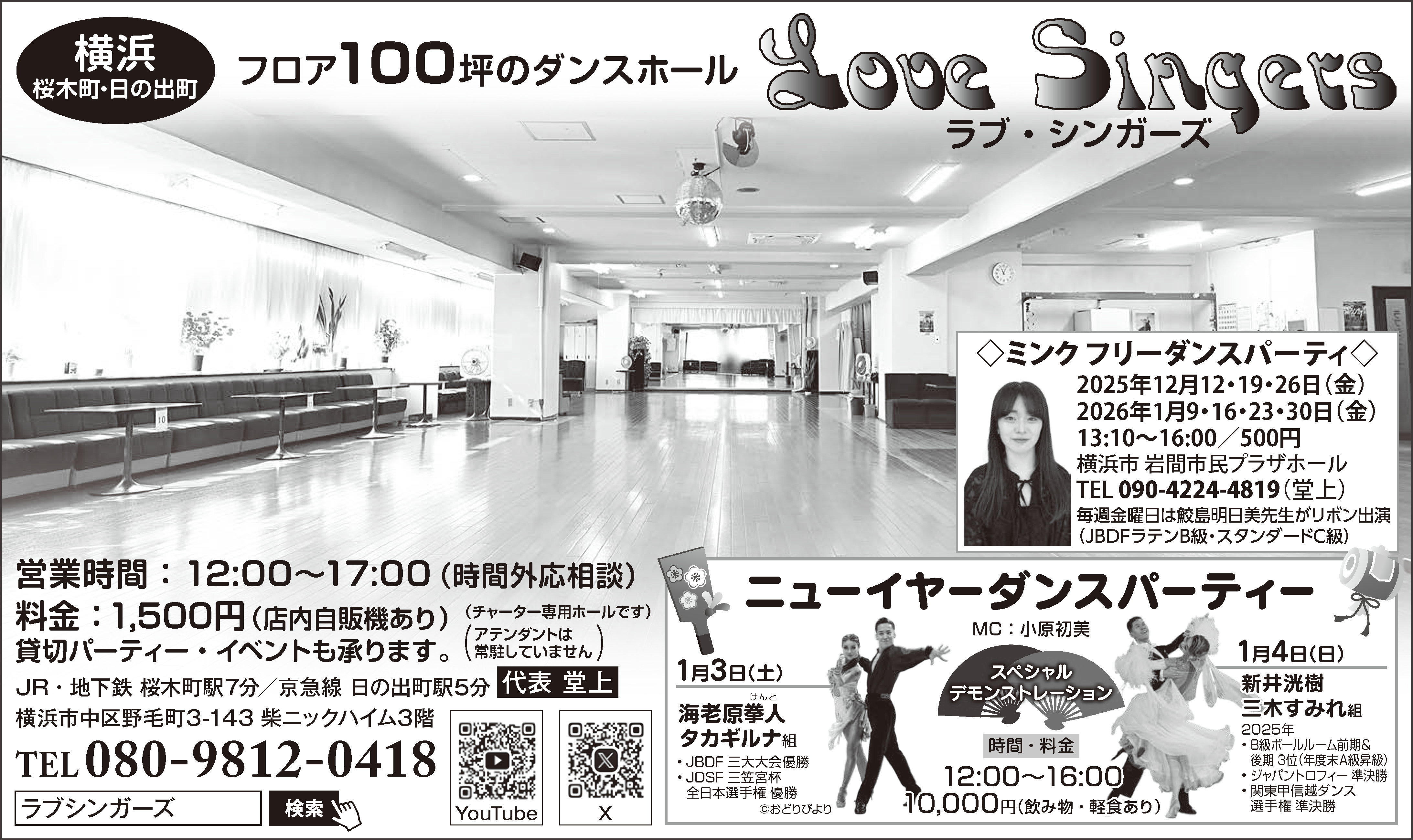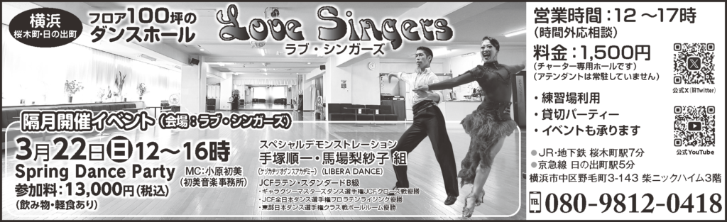 横浜市桜木町駅と日の出町駅の両駅からほど近く、100坪のフロアを誇るダンスホール「ラブ・シンガーズ」では、奇数月の第4日曜日にパーティ-を開催しています。