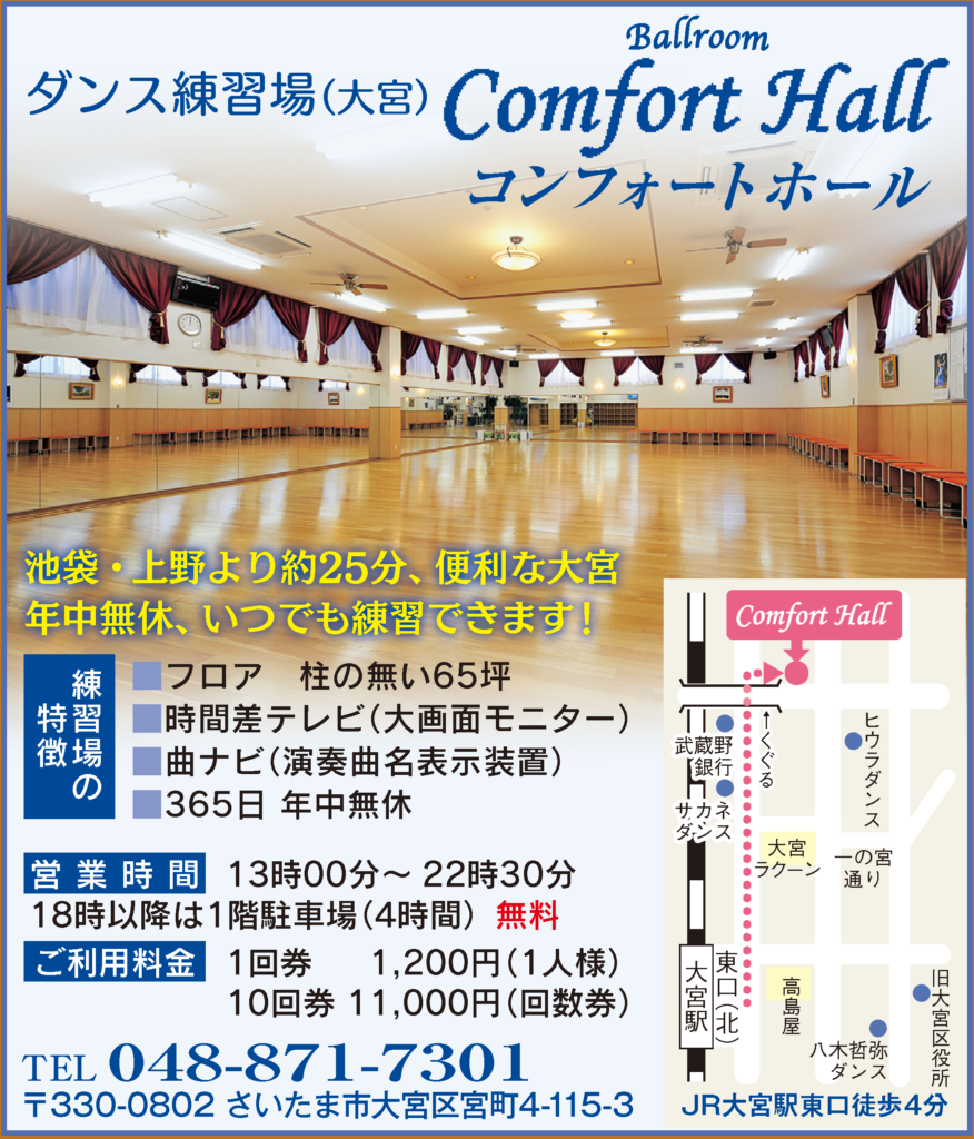 埼玉県の大型タウン、大宮にあるダンス練習場「コンフォートホール」は今年11周年を迎えました。競技選手や愛好家からの支持を得て年中無休で営業中。時間差テレビが練習に便利と利用者に好評です。