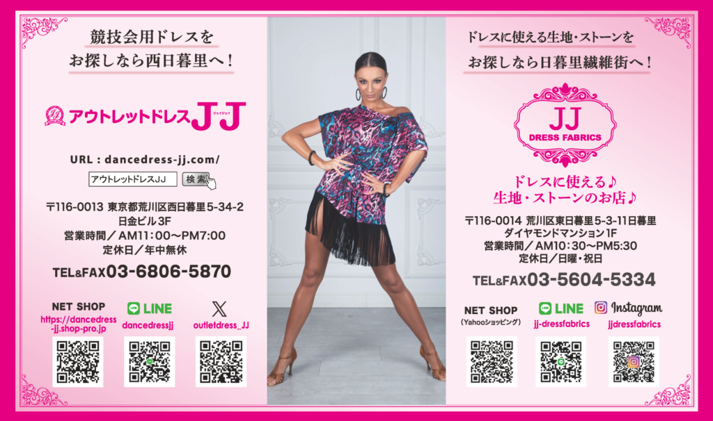 西日暮里の「アウトレットドレスJJ」は社交ダンス衣装専門として、競技やデモ用にも映える華やかで装飾豊かなドレス(羽根、ストーン、フリンジなど)を多数取り揃えています。