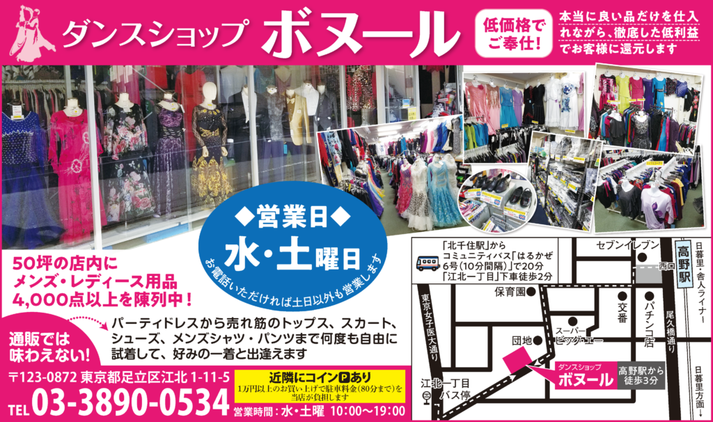 東京都足立区、日暮里・舎人ライナー「高野駅」徒歩5分のダンスショップ「ボヌール」では「センスある商品を低価格で」をモットーに、、店内に約4,000点におよぶレディース、メンズ用品、シューズ、アクセサリーを陳列して、みなさまのご来店をお待ちしております。
