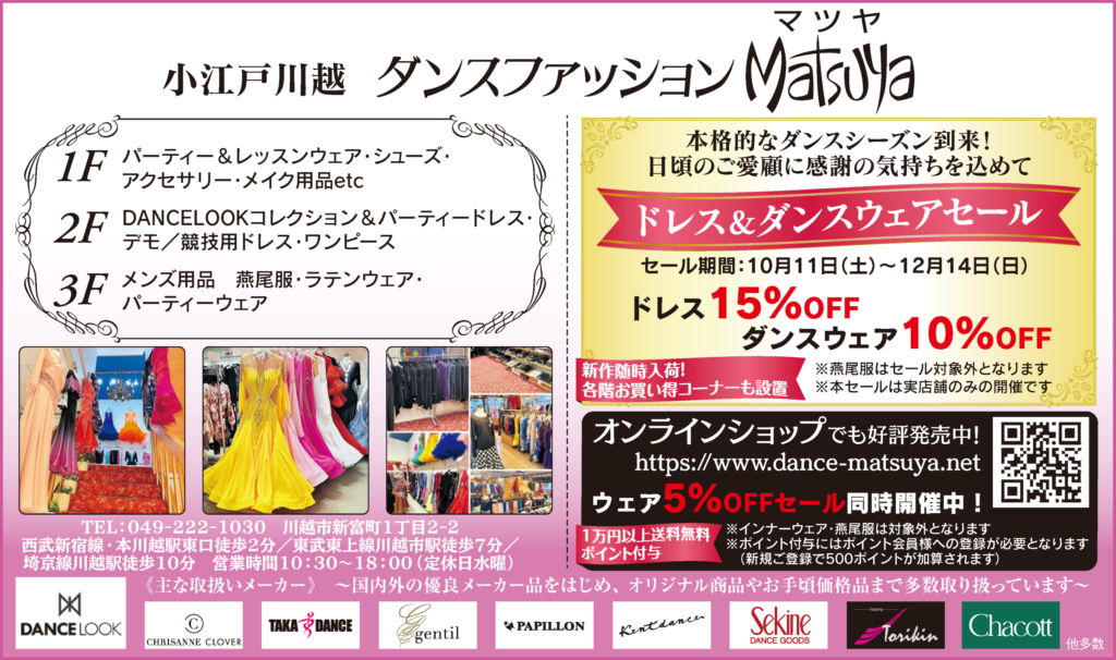 埼玉県川越市で西武新宿線、東武東上線、埼京線の3路線からアクセス可能な「ダンスファッション マツヤ」では、広い店内に多種多様なダンス用品を用意して、皆様のお越しをお待ちしております。ネットショップも好評展開中です。
